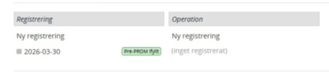 2026-03-30Nu dyker det upp en liten grön ruta med texten ”Pre-PROM ifyllt” när patienten har fyllt i prePROM-formuläret (se bild till höger). Detta efter ett fint förslag från en av deltagarna vid den digitala registerdagen i januari.